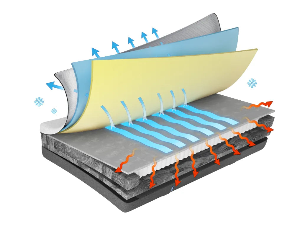 Eficaz en la regulación de la temperatura, infundido con partículas de grafito, un conductor térmico de alta capacidad que absorbe el calor de tu cuerpo y lo disipa fuera del colchón, ayudando a mantener tu temperatura 1,5 grados más baja, para que puedas dormir más rápido y profundamente. Ideal para personas muy exigentes y sensibles al calor.Precio habitual A partir de €769,00Precio habitualPrecio unitario por -