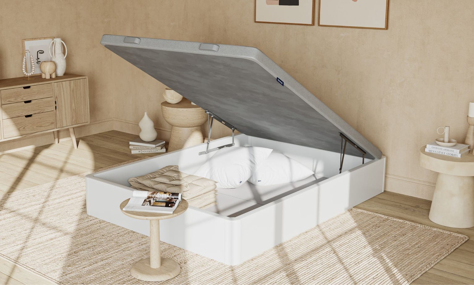 Su sistema de resortes hidráulicos facilita la apertura del canapé: tira un poco del asa de haya lacada y se abrirá prácticamente solo. Además, no hace nada de ruido. Sin duda, un práctico armario horizontal.